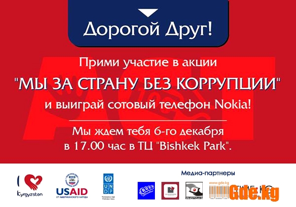 Мобильная акция "Коррупцию – победим!" пройдет 9 декабря: по центральным улицам столицы будет колесить "Антикоррупционный Автобус". Во время остановок представители Молодежного Движения "Я люблю Кыргызстан" будут раздавать водителям автомобильные наклейки, прохожим - информационные брошюры, а детям - шарики с антикоррупционной символикой акции. Таким нестандартным способом организаторы хотят привлечь внимание общества к проблеме коррупции и призвать граждан к активной жизненной позиции! Приходите! Чем больше нас, тем сильнее будет противодействие коррупции.