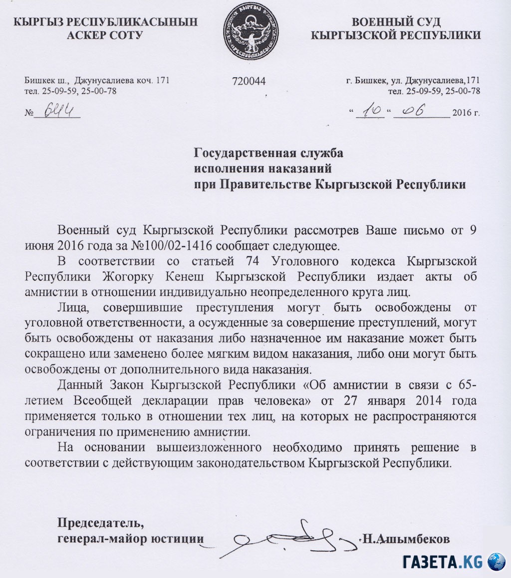 Тем не менее Военный суд КР не признает ошибку своих судей, вынесших данный приговор, но при этом направляет ГСИН КР письмо, в котором указывает на то, что эти законы предусматривают ограничение по амнистии.